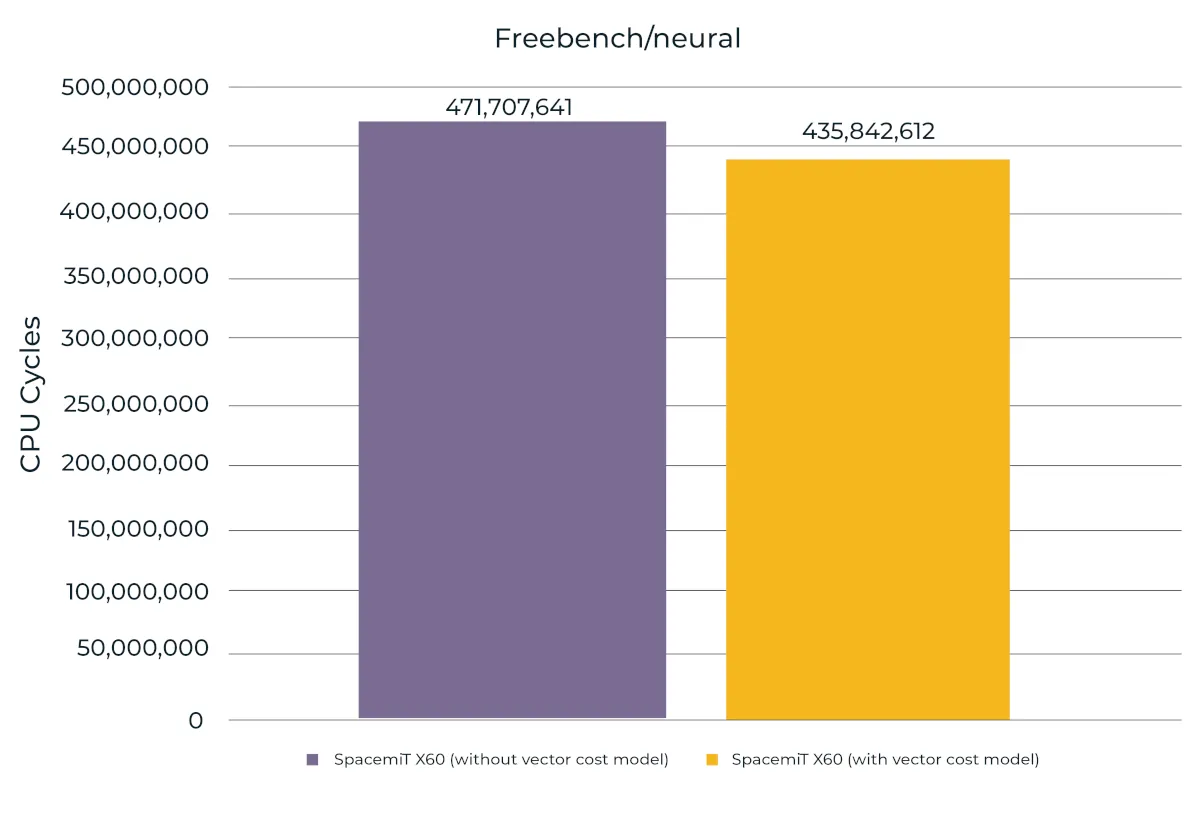Figure 3. CPU cycle counts for the FreeBench neural benchmark with and without the vector cost model