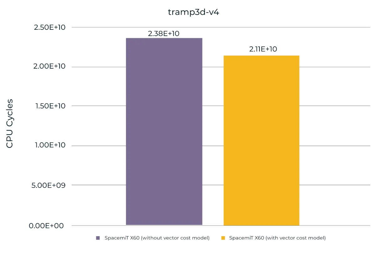 With the vector cost model, CPU cycles for this workload dropped from 2.38 × 10¹⁰ to 2.11 × 10¹⁰, showing an 11.41% improvement. This confirms that the model provides a more effective instruction schedule even in scenarios with high computational density and complex data dependencies where the scheduler is under maximum stress.