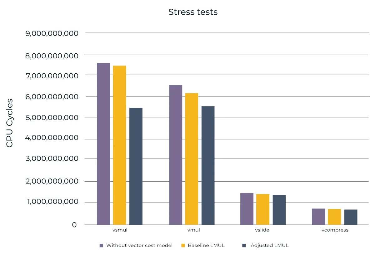 The following graph illustrates the performance impact across several stress tests when replacing a fixed-latency model (assuming LMUL=1) with dynamic LMUL-based cost scaling implemented in the scheduler, while also comparing against a configuration without vector cost modeling.