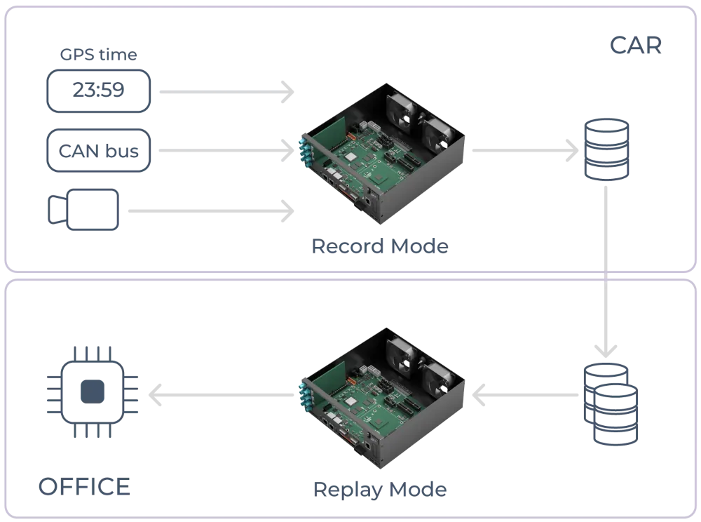 Not only the fact that collected data are very fast and need to be all synchronized to single tamistamp source, but the mode of the use while tge test vectors are recorded, 40 hours per week of grabbing the data in car and 2 days during weekend to sort and prepare for future usage, require huge storage modules and extremely high transfer data rates.
