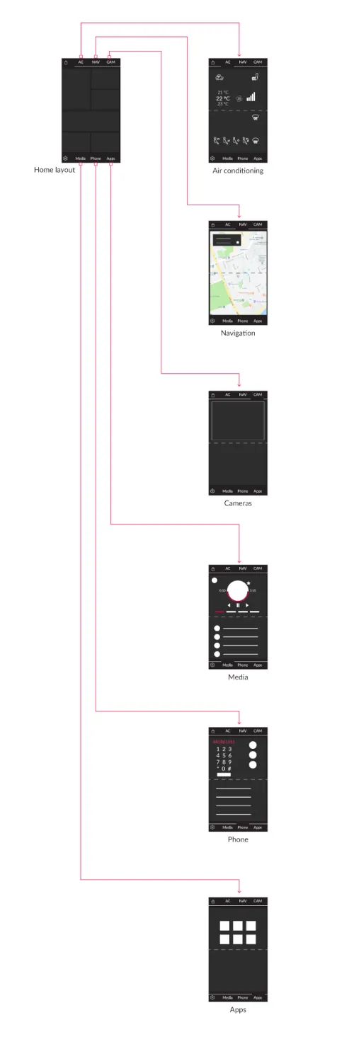 Menu hierarchy should not be visually respected. For mobility HMI solutions it is essential that all options are at the disposal within a first glance, or at hand with a button press. Therefore, going back and forth in the hierarchy would be complex, distracting and not suitable for the in-vehicle UX. Therefore, instead of hierarchy, we are using visual composition which means that all relevant components are available within the UI space.