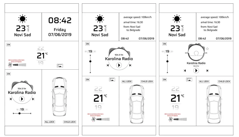 Home screen is adaptable to context, meaning that all triggers and events available within the car may influence the state of the UI. For example, contexts such as driving, parking, preparing to start, stopping and exiting, waiting on a traffic light or else are considered. UI is tailored in a way to give room to options and/or functions which are suitable to a certain context, with the goal to minimize access time and to maximize UX factor.