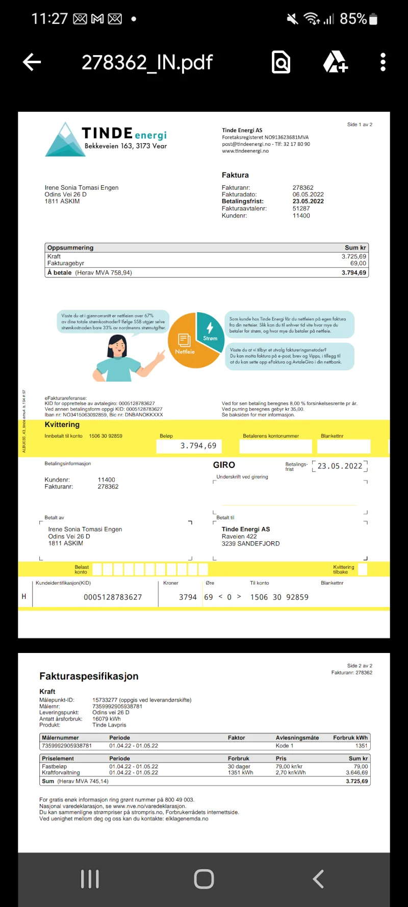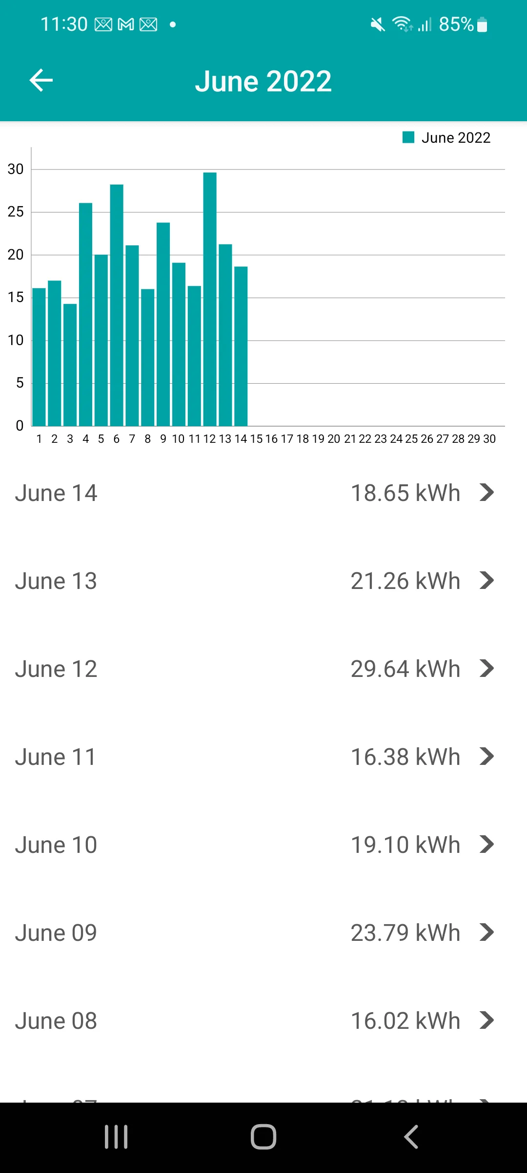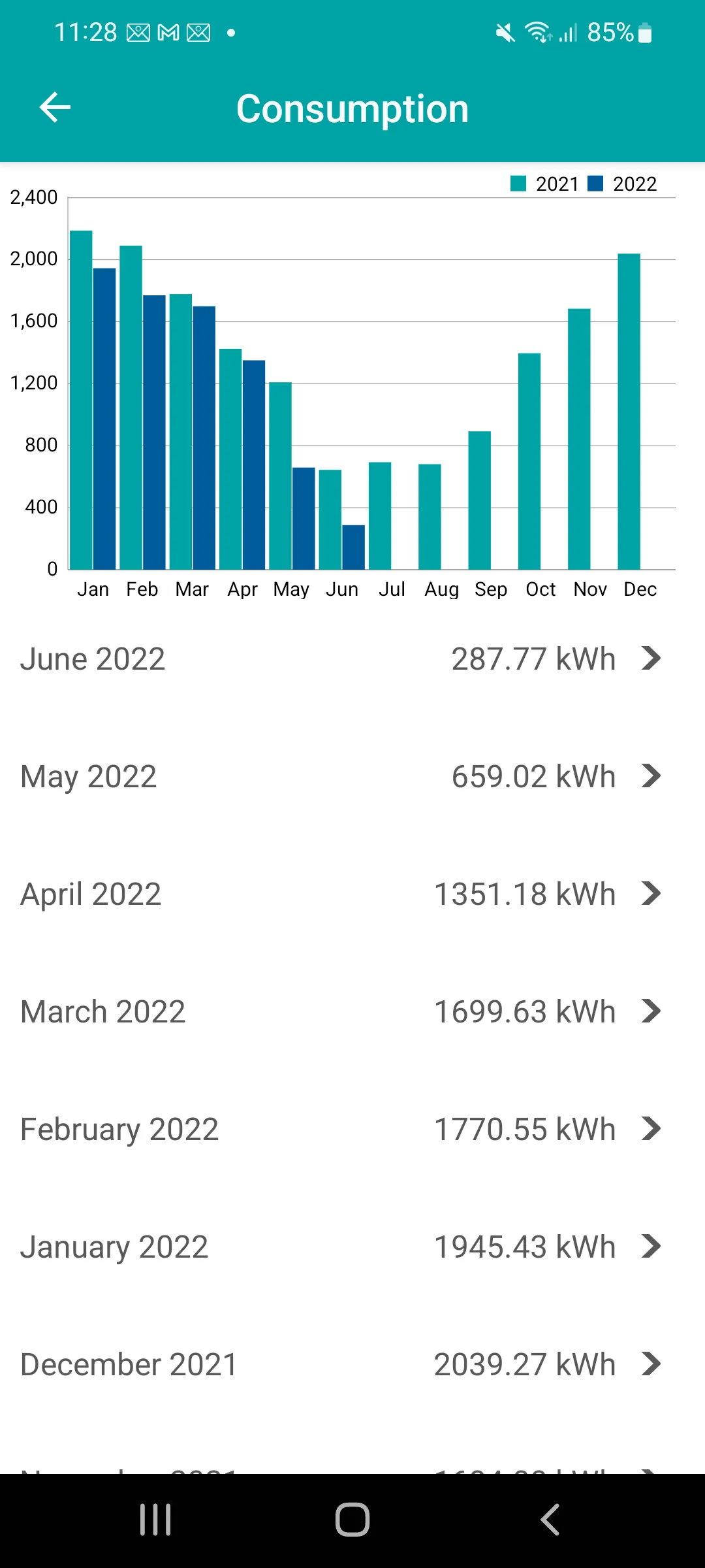 The user is always aware of the power consumption, and can compare two periods, such as presented in the example below (consumption in June this year vs June last year).