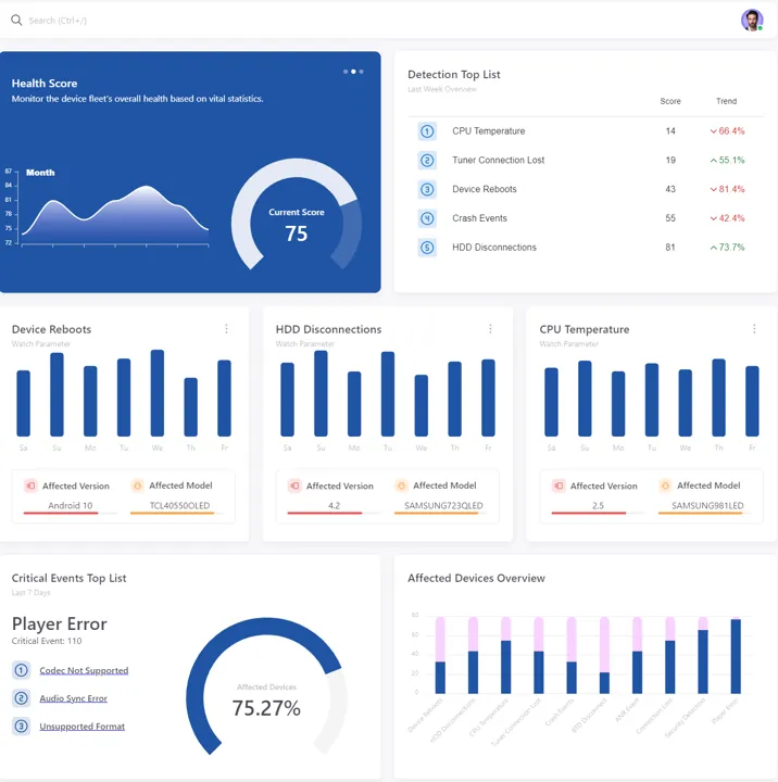 Figure 3. TV diagnostics dashboard with health score and device performance metrics