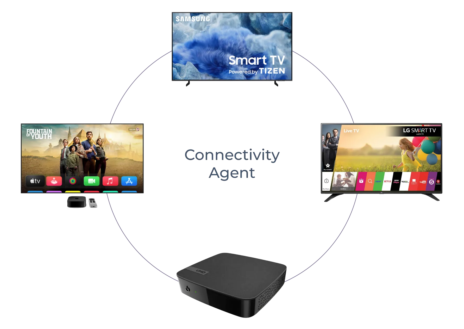 Connectivity Agent linking a Setup Box with STBs, Samsung Tizen, LG webOS, and Apple TV devices